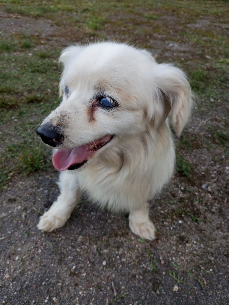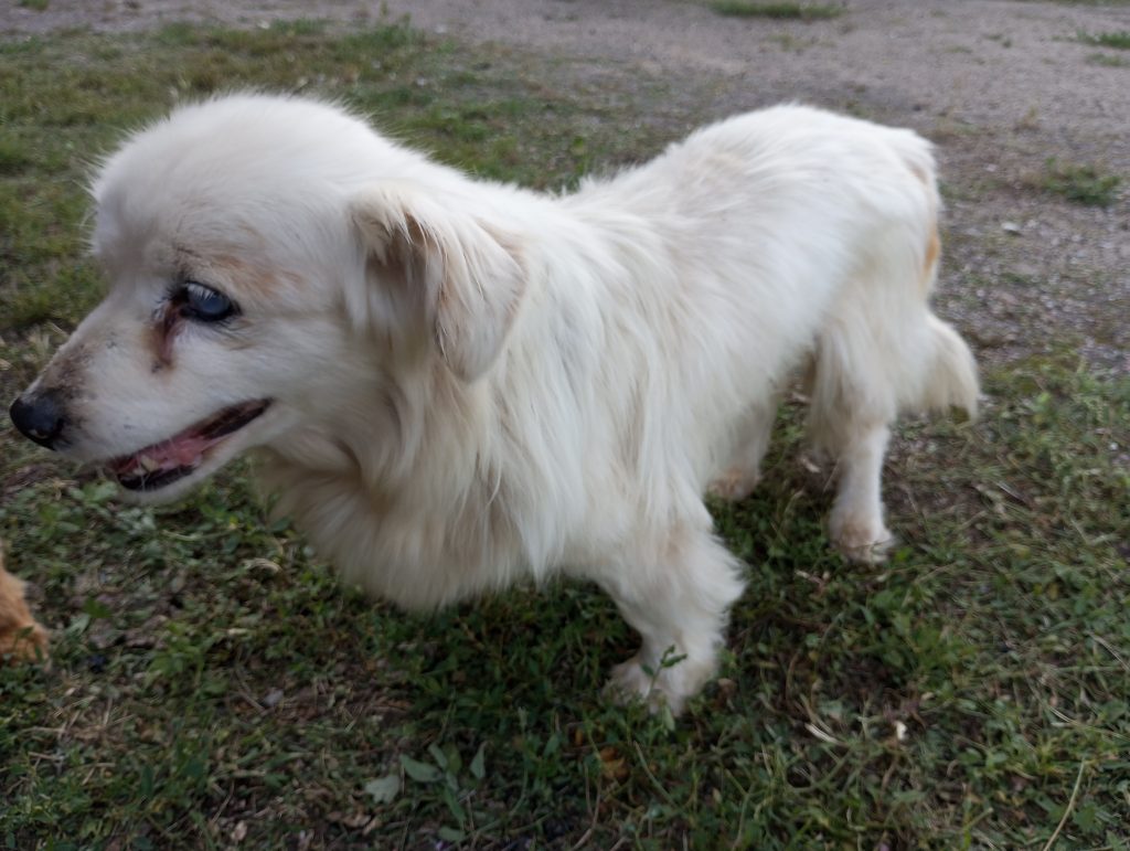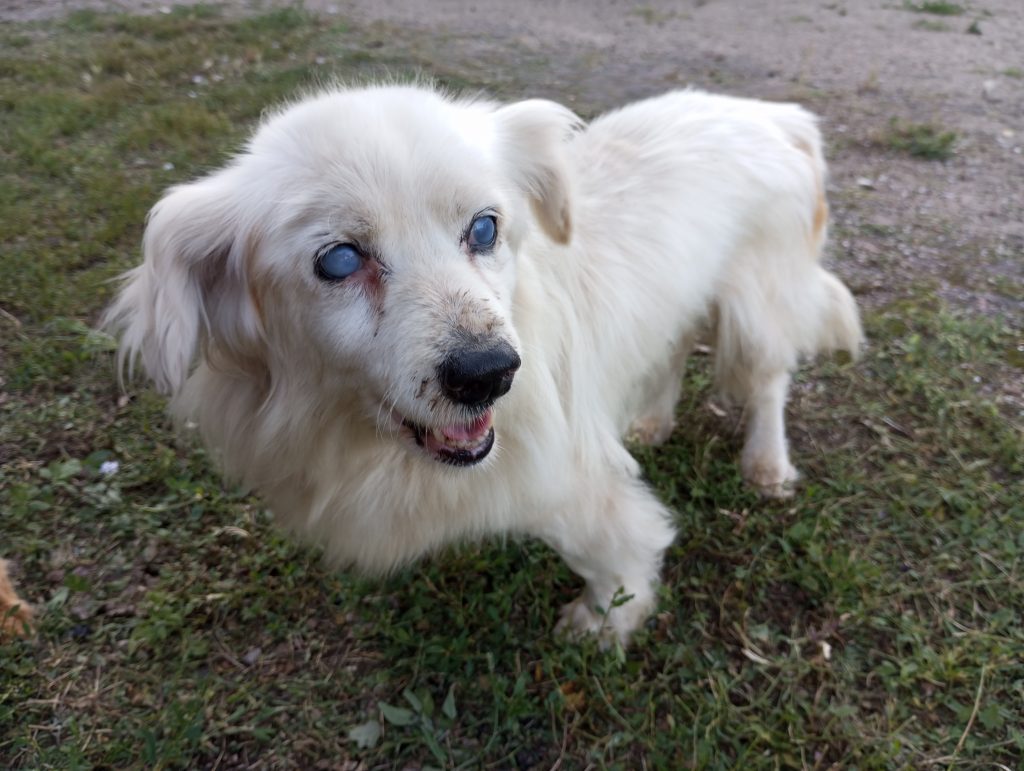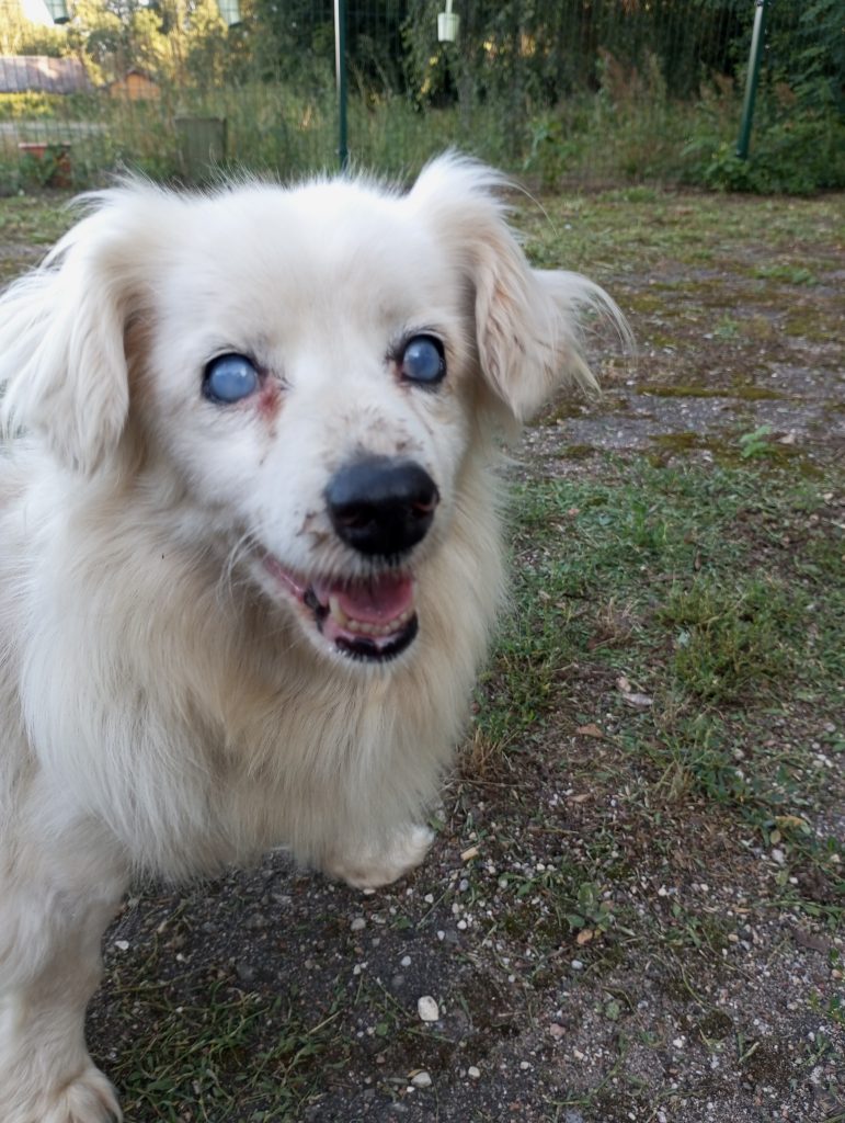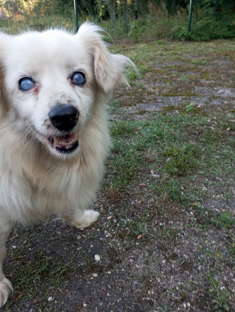 Genauso war es bei Bobute (alte Dame), deren Ankunft echt schwer zu verstehen war. Die Hündin war total blind und taub und wurde einfach an der Straße ausgesetzt. Wenn nicht ein gutes Paar sie gefunden hätte, wäre die Kleine wahrscheinlich nicht mehr am Leben… Die Leute, die sie gefunden haben, sagten, dass sie direkt an der Straße lag und sie zuerst dachten, dass sie schon tot war, aber als sie anhielten und näher kamen, merkten sie, dass sie noch lebte. Sie war nur sehr erschöpft und abgemagert (sie war nur noch Haut und Knochen). Die Hündin wurde zum Tierheim gebracht, sie erholte sich nur langsam, aber nach einer Weile kam sie wieder zu Kräften. Sie hatte eine Pyometra (eine eitrige Gebärmutter), aber das Problem wurde schnell gelöst – sie wurde sterilisiert und die Gebärmutter entfernt. Außerdem hat die Hündin einen alten Bruch, der schon lange verheilt ist, und sie läuft gut, nur sieht man, dass ihr Bein anders ist. Diese Hündin ist nicht nur älter, sie ist wirklich sehr, sehr alt, ihr Alter ist unbekannt, aber man schätzt, dass sie zwischen 15 und 20 Jahre alt ist. Wir wissen natürlich, dass es fast unmöglich ist, für einen Hund in diesem Alter ein Zuhause zu finden, aber wenn jemand ein Herz hat und dieser alten Dame den besten Lebensabend schenken möchte, dann meldet euch bitte bei uns.