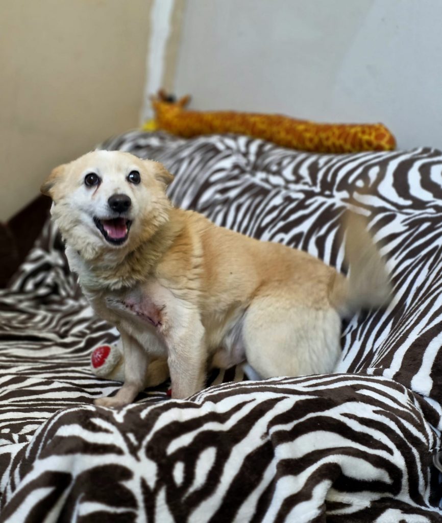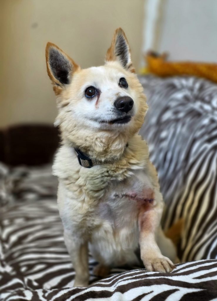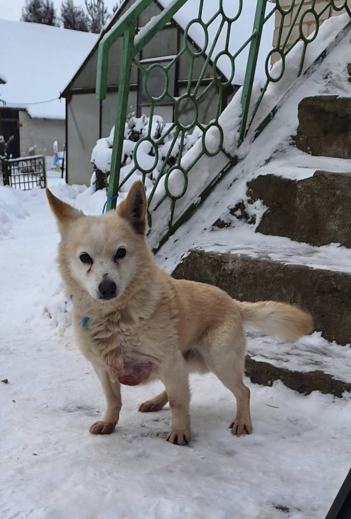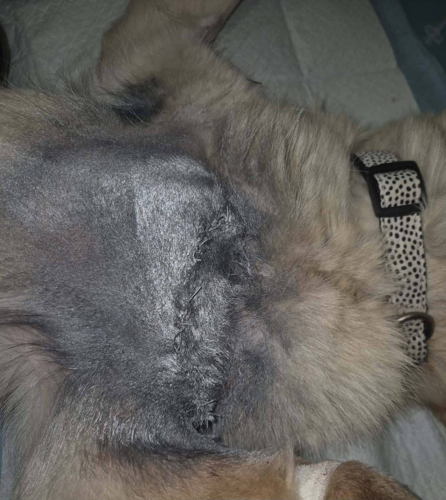 Ciobrelis (Thymian) kam zu seinem Glück zu freundlichen Menschen auf einen Bauernhof mit einem großen, unansehnlichen und bereits aufgebrochenen Geschwür über seiner Vorderpfote in der bitteren Kälte des Winters… Er wurde sofort operiert und die Fäden können nun entfernt werden. Jetzt muss nur noch das Fell nachwachsen, um die Narbe zu verdecken.
