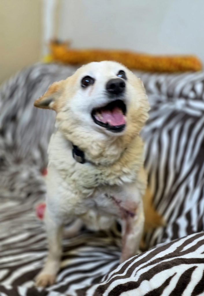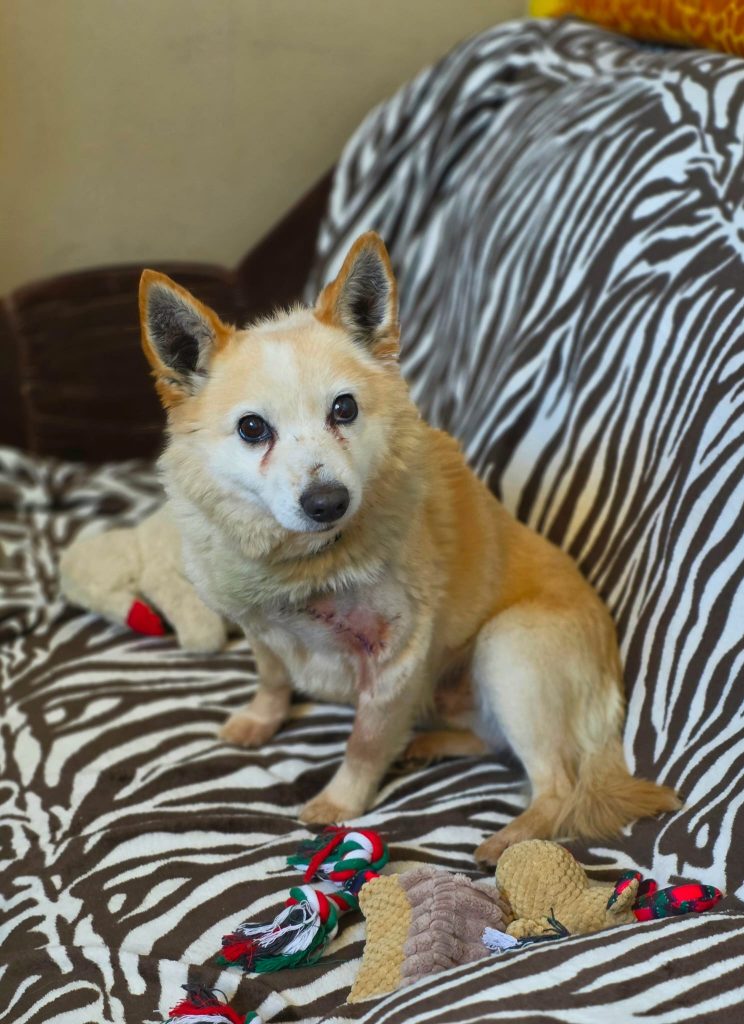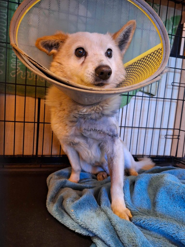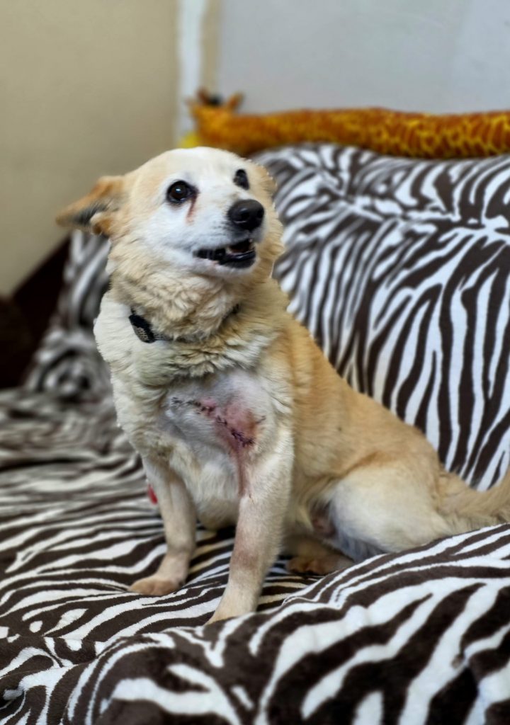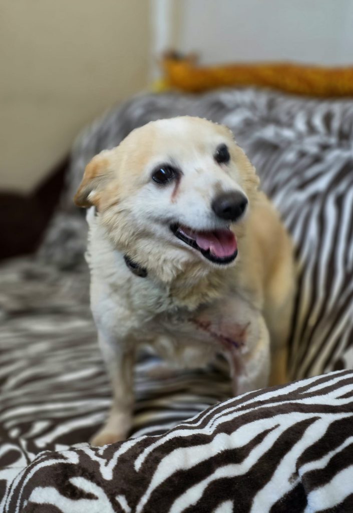 Ciobrelis (Thymian) kam zu seinem Glück zu freundlichen Menschen auf einen Bauernhof mit einem großen, unansehnlichen und bereits aufgebrochenen Geschwür über seiner Vorderpfote in der bitteren Kälte des Winters… Er wurde sofort operiert und die Fäden können nun entfernt werden. Jetzt muss nur noch das Fell nachwachsen, um die Narbe zu verdecken.