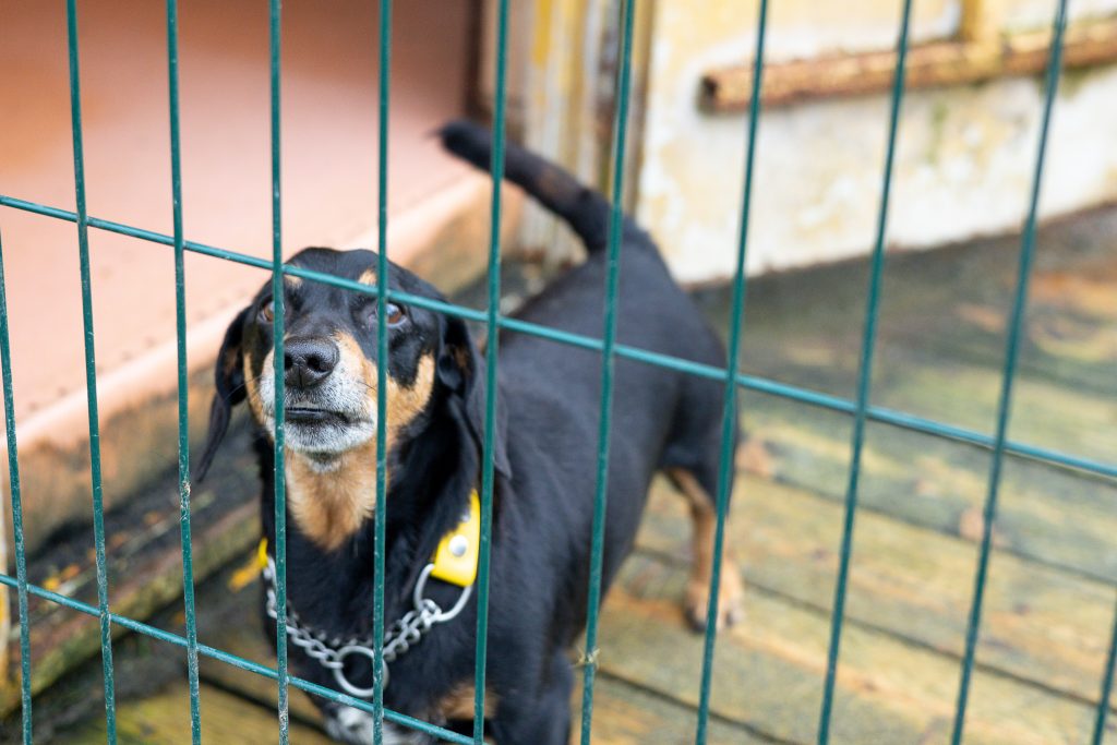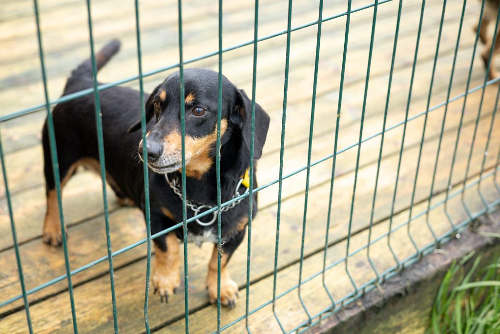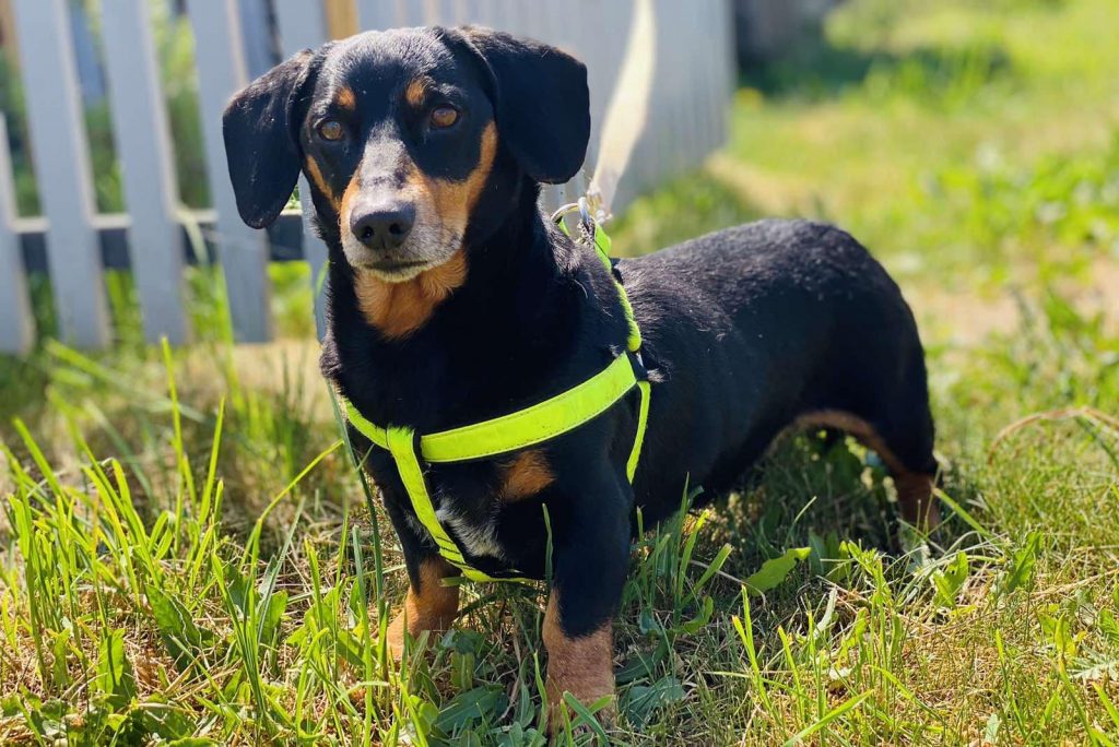 Mailo – ein freundlicher kleiner schwarzer Dackel Kerl, der in fremdes Grundstück gelaufen ist und niemand kam, um nach ihm zu suchen.