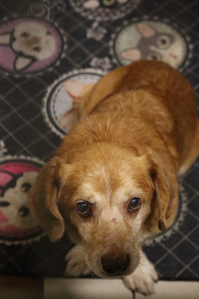 Obwohl er schon älter ist und einen traurigen Blick hat, ist er ein fröhlicher Hund, der mit seinen kurzen Beinen recht gut springen kann und gerne hoch hinaufsteigt, um die Umgebung zu beobachten.