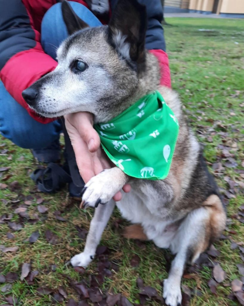Er wurde verloren auf der Straße herumirrend gefunden. Stell dir einen blinden, alten, schwachen Hund vor. Wie beängstigend muss das gewesen sein. Eine Woche später meldete sich sein Besitzer und gab zu, dass sie ihn als blinden Hund immer „alleine spazieren gehen” ließen. Und das neben einer super belebten Straße. Einfach unfassbar. Natürlich wollte der Besitzer ihn nicht zurück, was wahrscheinlich das Beste ist.